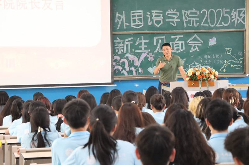 外国语学院于主教学楼C214教室举行了2025级新生开学典礼暨新生见面会,告诉同学大学期间需要具备“Possibility(可能性)、Ability(能力)、Curiosity(好奇心)”三大核心成长技巧,并以十分幽默的方式向同学们传授语言学习方法。