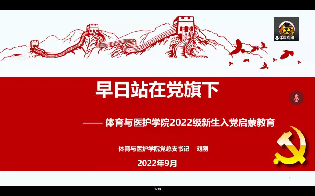 月日上午为帮助级新生更好地了解党的基本知识、认识党的发展历程、端正入党动机引导新生积极向党组织靠拢。体育与医护学院在线上开展级新生入党启蒙教育系列之早日站在党旗下。体育与医护学院党总支书记刘刚、学工办主任周晓丹、分团委书记胡林林担任主讲人级全体辅导员及新生参会学习。主讲人通过六个专题辅导从为什么要有信仰信仰共产主义的笃定理由是什么为什么说中国共产党是一个能带领国家强起来、人民富起来的党为什么说加入