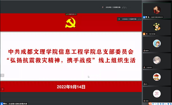 月日下午信息工程学院党总支开展弘扬抗震救灾精神携手战疫线上组织生活会。学院全体师生党员参会。首先学院全体师生党员一同观看飞架生命桥党员突击队救援四川灾区的视频。自四川泸定地震发生以来有万多名党员干部冲在抢险救灾一线救人民于水火之中哪里最需要就出现在哪里哪里最危急就战斗在哪里用生命守护着生命。危难时刻共产党员义无反顾地奔赴给人力量让人心安。党员同志们感受到了理想信念的强大力量。然后学生党员李萍、谯星