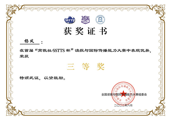 首届高教社杯全国读报与国际传播力大赛近日公布了获奖名单。我校外国语学院由陈雪瑶老师指导的级英语专业陈秋月同学及由黄韵颖老师指导的级英语专业杨凤同学获得全国三等奖外国语学院黄陈陈、李川冉、李梦雪、李思君、刘亿茹、唐影、马倩、王婧雯、谭湘、余巧伶、张芮境、邹欣洋等位同学获优胜奖我校同时获得优秀组织奖。高教社杯全国读报与国际传播力大赛由高等教育出版社和上海市科技翻译学会主办由上海对外经贸大学国际商务外语
