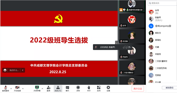 为加强学院四位一体全员育人体系建设月日晚上时会计学院党总支开展级班导生选拔工作。会计学院各支部书记及学生党员参加了此次选拔。此次选拔中唐晴、周沁雨等余名学生党员从自我介绍、对班导生工作的认识、工作打算以及自身优势三个方面进行了详细阐述同时结合自身实际分享了以后开展班导生工作的思路和规划表达了自己热心为级新生做好服务和带头引领的决心。最后评委老师们针对每位同志的陈述进行了一对一提问参加竞选的同志分别