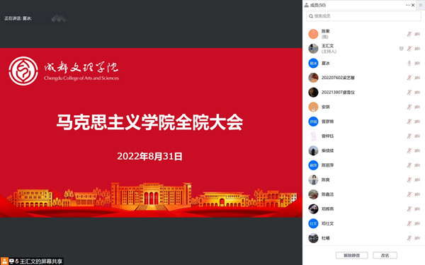 月日晚上:马克思主义学院召开线上全院大会会议由学院副院长夏冰主持马克思主义理论教研室主任古威、思想政治教育教研室主任柴续续、学工办主任袁久斌、各课程组负责人和学院全体教师参加。会议主要围绕新学期开学工作进行部署安排。会上夏冰首先传达了学校教学工作会的各项要求强调要抓紧时间在开学前完成好各项准备工作做好部分新生到校的安排工作充分保障课堂教学的规范和有序。其次就线上教学工作的注意事项和相关要求向全院教