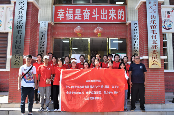 为让当代大学生深刻了解国家乡村振兴战略更好培养大学生的责任担当和爱国情怀月日日期间会计学院传承红色基因助力乡村振兴暑期社会实践团队赴宜宾市兴文县僰王山镇博望村、共乐镇毛村、古宋镇白塔山烈士陵园开展了为期三天的暑期三下乡社会实践活动。月日伴随着嘹亮的口号社会实践活动全体成员从学校出发大家对此次征程充满了信心带着向往与憧憬踏上意义非凡的征程。从参观僰王山镇博望村的特色农产业果园生产基地到了解共乐镇毛村