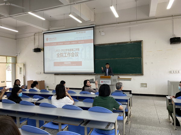 月日下午时外国语学院全体教职工于主教学楼教室召开学年度第二学期期中全院工作会议。此次会议由外国语学院院长王维民主持、骨干教师雷婕、各教研室、中心主任、副主任、辅导员、教学秘书及外国语学院全体教职工参会。王维民牵头介绍了新入职的教师、辅导员和教学秘书对新入职的教职员表示了热烈的欢迎同时他也介绍了新近任职的院长助理、教研室、中心主任、副主任等。雷婕针对本学期以来教学运行、教学检查、评估工作情况做相关通