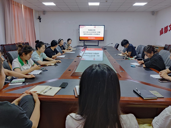 月日上午外国语学院在行政楼三楼指挥中心召开本学期暑期安全教育工作部署会议。党总支副书记苏凌函、学工办主任徐杏以及全体辅导员参加此次会议。徐杏对近期的工作进行安排部署重点围绕期末考试、学生离校和实习安全工作、毕业生档案清理等相关问题展开。要求各年级利用期末考试前这段时间通过主题班会等形式积极引导学生认真复习诚信考试端正学习态度树立良好学风。同时要结合实际情况做好寒假安全教育工作和安全隐患排查工作确保
