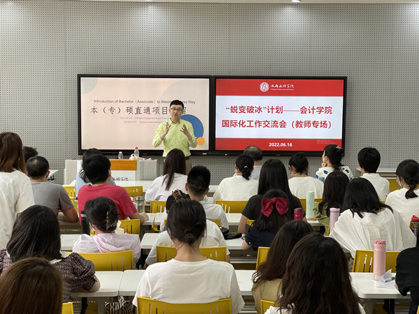 为进一步推进国际化工作开展强化会计学院专职教师对于国际化工作认识月日下午时分会计学院在主教学楼教室开展蜕变破冰计划国际化工作交流会教师专场。本次交流会由国际教育学院副院长赵亮主讲会计学院院长李来儿、党总支书记吴操、副院长王晓秋以及学院全体专职教师参加此次交流会。会上赵亮以会计专业的学生考证和学历提升的选择、国内外考研的区别两个问题为引入董秉伟、余春波两位老师就此两个问题与现场老师进行了交流发表了自