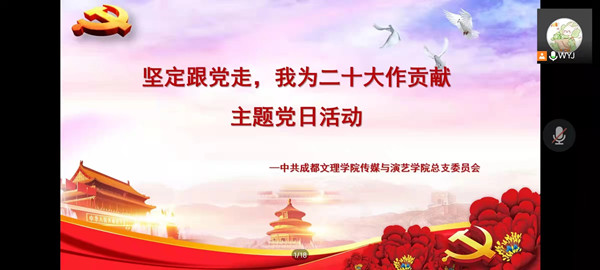 月日中共成都文理学院传媒与演艺学院总支委员会开展了坚定跟党走我为二十大作贡献主题线上党日活动。本次活动分为社会主义核心价值观教育、党员组织关系转接认知教育、发展党员知识教育几个部分。会议由传媒与演艺学院党总支组织员王艳菊主持。王艳菊对全体毕业生党员进行了社会主义核心价值观教育。她讲到青年学生应深入学习贯彻落实习近平新时代中国特色社会主义思想的核心要义坚持和发展中国特色社会主义。她希望各位毕业生党员