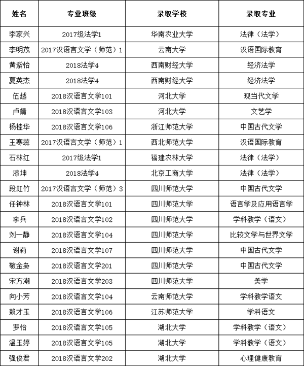 近日年全国硕士研究生录取结果陆续揭晓文法学院学子考研捷报频传。在学院领导的大力关心与支持以及全体师生的共同努力下文法学院年考研工作再创佳绩截止目前共考取国内外研究生名。星光不问赶路人岁月不负有心人。在受新冠肺炎疫情严重影响和考研竞争压力持续增大的情况下学院名同学分别被云南大学、华南农业大学、西南财经大学、河北大学、浙江师范大学、四川师范大学、江苏师范大学、圣路易斯华盛顿大学等国内外高校录取。这些考