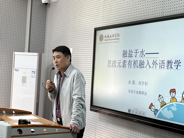 月日下午时分外国语学院在主教学楼室开展了主题为融盐于水思政元素有机融入外语教学的英语专业教研室教研活动。活动由英语专业教研室主任余霞主持余霞、刘宇杉两位老师主讲英语专业全体专职教师参会。外国语学院院长王维民讲话。王维民结合自身几十年的教学经历谈到英语专业在学校的地位举足轻重英语专业教师要增强责任感、使命感提升格局并指出现在的付出是将来的收获收获不一定是物质的也可能以其他形式出现。他希望老师们辛勤工