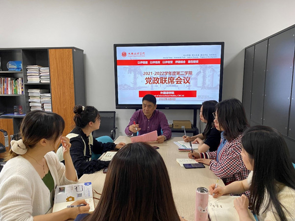 月日外国语学院在行政楼召开党政联席会议。会议由外国语学院院长王维民主持党总支副书记苏凌函院长助理雷婕学工办主任徐杏英语专业教研室主任余霞、副主任王小芳参会。此次会议主要议题是学院就业、国际化、双创工作情况通报。会上王维民就月日学校的就业工作会议内容做简要通报。随后学院党总支副书记苏凌函就学院目前就业、国际化、双创工作情况做通报和解读。她指出应届生总体就业形势严峻。学生缓就业、懒就业明显学生意识不到