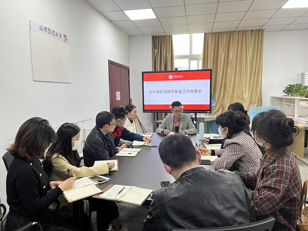 月日下午时会计学院召开清明节安全工作部署会。会计学院党总支书记吴操、学工办主任李晓卫及全体辅导员参加了本次会议。在月日全体辅导员已针对各班级召开清明节前安全教育主题班会辅导员们就学生的疫情防控、人身安全、防盗抢骗、交通安全、食品安全等多个方面对同学们进行了专题教育并针对各班印发了清明节安全教育提纲切实认真做好学生的离留校登记对学生的离校和返校也做了相应的要求。部署会上吴操就此次清明节假期期间的安全