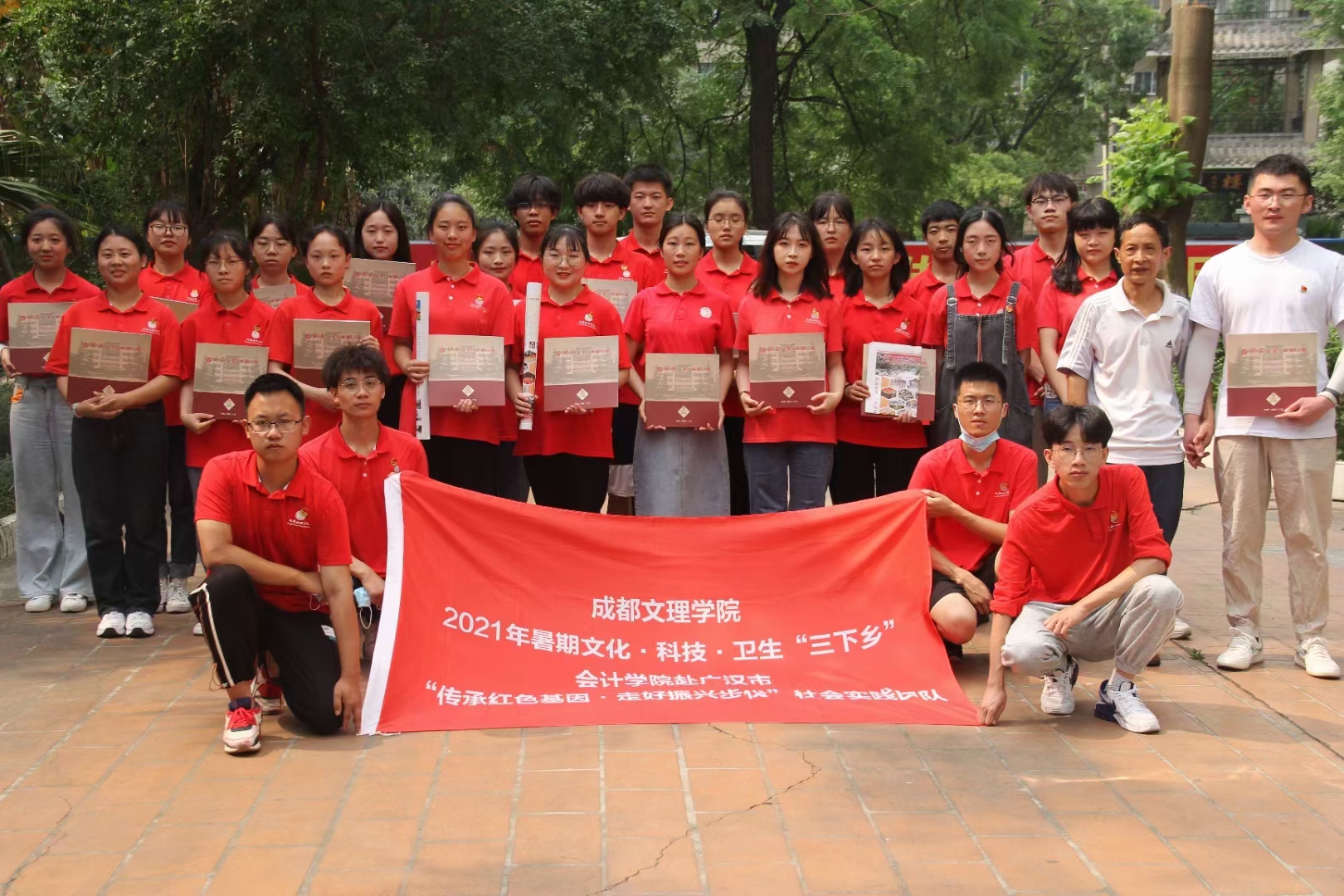 为提高大学生的思想认识及社会实践能力积极响应大学生投身社会主义新农村建设的号召月日至月日会计学院年暑期文化科技卫生三下乡社会实践团队赴广汉市开展以传承红色基因走好振兴步伐为主题的社会实践活动。本次活动由会计学院分团委书记张须鹏带队部分学生干部参加了此次活动。月日上午会计学院社会实践团队到达广汉市前往三水镇拜访了光荣在党七十年、曾参与过抗美援朝的老兵李元盛爷爷在李爷爷的故事中感受和传承红色精神。下午