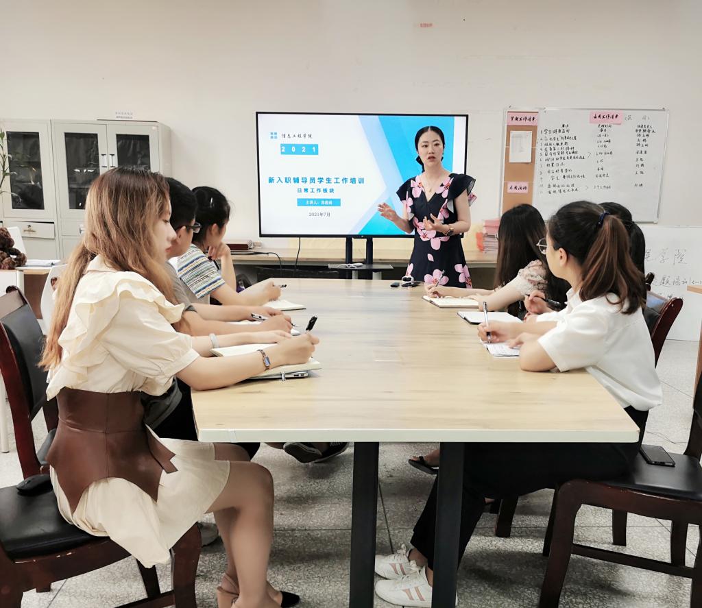 近日信息工程学院举办年新辅导员入职培训班旨在帮助新入职辅导员明确岗位职责树立岗位理想增进职业领悟掌握岗位技能尽快进入工作角色更好地胜任辅导员岗位要求。学院学生工作各版块负责人分主题对新进辅导员展开系统培训。贾冲以强作风严纪律守初心尽其能为专题指出要加强辅导员作风建设做到求真务实、开拓创新要凝心聚力打造一支政治强、业务精、纪律严、作风正的辅导员队伍要围绕学生关照学生服务学生牢记辅导员的工作职责守好一