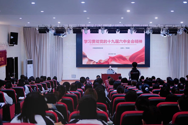 按照学校党委及外国语学院党总支关于深入学习贯彻党的十九届六中全会精神的安排部署持续推动党史学习教育和三风建设工作不断深化政治理论学习深刻领会党的十九届六中全会精神以及中共中央关于党的百年奋斗重大成就和历史经验的决议以下简称决议的核心要义和实践要求秉持党团联动一起学的原则月日上午外国语学院党总支在学工部学术报告厅举办党的十九届六中全会精神专题辅导讲座学院党总支副书记苏凌函现场授课学院全体思政辅导员、