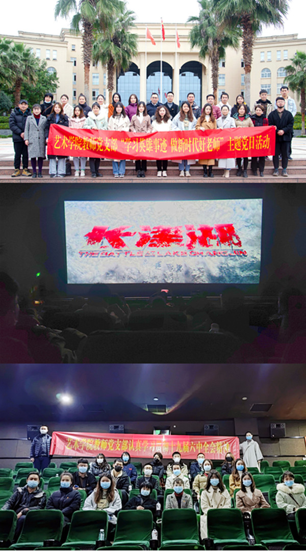 艺术学院教师党支部在认真学习贯彻党的十九届六中全会精神下为进一步加强爱国主义教育、弘扬爱国主义精神、厚植教师党员的爱国主义情怀月日下午时支部组织开展了学习英雄事迹做新时代的好教师主题党日活动走进影院集体观看爱国影片长津湖。影片以抗美援朝战争第二次战役中的长津湖战役为背景讲述了中国人民志愿军连队在极寒严酷环境下坚守阵地、奋勇杀敌扭转了战场态势打出了军威国威的感人故事。体现了志愿军战士服从命令视死如归