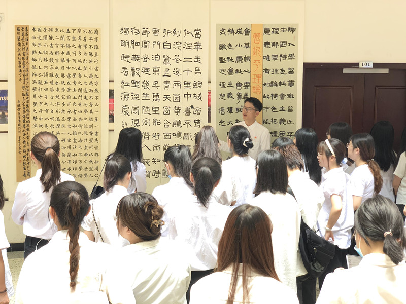 月日中午时分教育学院学生第二党支部于学工部一楼大厅组织庆祝中国共产党成立周年红色华章;百年辉煌主题书法展教育学院学生党支部到场布展并向参观师生介绍作品。本次展出作品共计百余件创作者为教育学院书法学专业学生展出的书法作品反映了我国不同时期书法的主要特征涵盖了各大书法名家及其代表作内容紧紧围绕建党百年这一主题吸引了大量同学前来参观。展出过程中杜晨飞同志一一讲解书法作品的笔法、章法以及历史渊源他讲解道欣