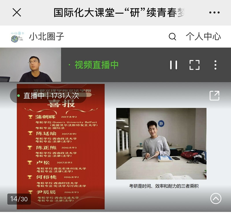 月日下午时文法学院开展了国际化大讲堂线上直播课程本次线上直播课程以研续海外梦想为主题由文法学院级法学专业学生蒲朝晖进行主讲。蒲朝晖同学是届优秀毕业生目前已收获所海外名校曾经担任国际班班长一职。在本次课程中蒲朝晖分别从大学经历、学习方法、名校机会以及平台的重要性四个方面进行了分享。他在校期间学习经历和社会实践经历都让同学们受益匪浅此外蒲朝晖还向大家介绍了英语和雅思的学习方法、国内考研形式以及申请海外