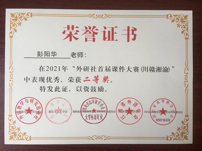 近日由外语教学与研究出版社主办的首届课件大赛川赣湘渝获奖名单揭晓我校外国语学院教师彭阳华获得二等奖。此次课件大赛面向西南四省重庆、湖南、江西、四川普通高等学校教师征集作品共有位高校教师参赛。参赛教师需基于指定教材、指定教学单元和指定页码的材料备课融合最新教学理论深入挖掘教材内涵制作出内容丰富、形式多样、环节完整、导向积极、设计完整的教学课件。大赛分初赛和决赛两个阶段进行。初赛由赛事组委会负责对参评