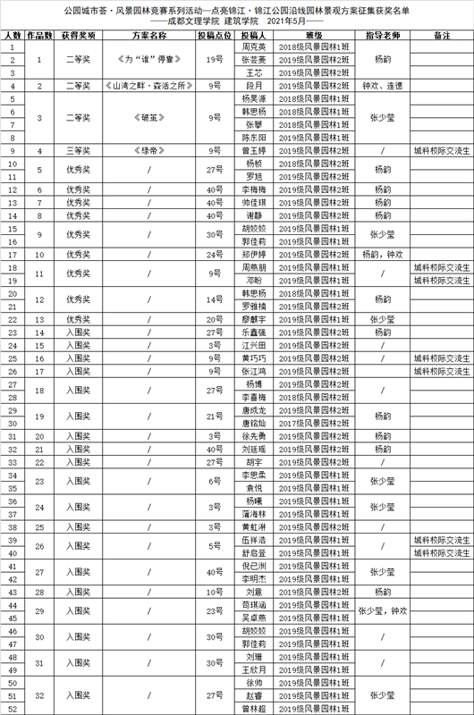 月日由成都市公园城市建设管理局、共青团成都市委主办、成都市公园城市园林绿化事业发展中心等单位承办的公园城市荟;风景园林竞赛系列活动点亮锦江;锦江公园沿线园林景观方案征集获奖名单正式公布。建筑学院有件作品获奖其中件作品荣获二等奖件作品荣获三等奖件作品荣获优秀奖件作品荣获入围奖获得优秀指导老师荣誉称号人。公园城市荟风景园林竞赛系列活动是以建设践行新发展理念的公园城市示范区为引领按照幸福美好生活十大工程