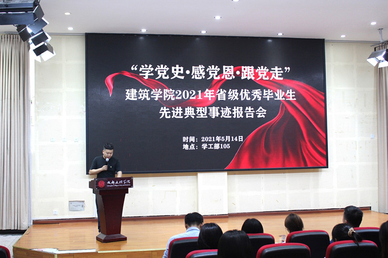 为迎接中国共产党建党周年深入开展党史学习教育、活化党史学习教育形式加强建设学生学习风气发挥省级优秀毕业生模范带头作用月日上午时建筑学院在学工部举行了学党史感党恩跟党走年省级优秀毕业生先进典型事迹报告会。建筑学院院长牟江、党总支书记贺元烨、学工办主任邓鹏、全体辅导员、届优秀毕业生代表、级和级学生参会。邓鹏向在场师生展示届省级优秀毕业生基本情况并做介绍随后由我院三位优大生展开分享。级建筑学班毕业生刘英