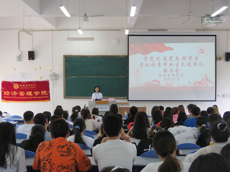 为庆祝中国共产党成立周年结合党史学习教育和省教育厅安排部署同时进一步推动学风建设充分发挥优秀大学生的榜样示范和引领带动作用月日中午时分经济管理学院于主教学楼举行学党史;感党恩;跟党走省级优秀毕业生先进事迹分享报告会。经济管理学院学工办主任刘婷及学院部分辅导员出席经济管理学院学生代表到场参加。本次报告会有幸邀请到我院级校友何菊返校分享她被评为届四川省优秀大学毕业生现就读于成都理工大学马克思主义理论专