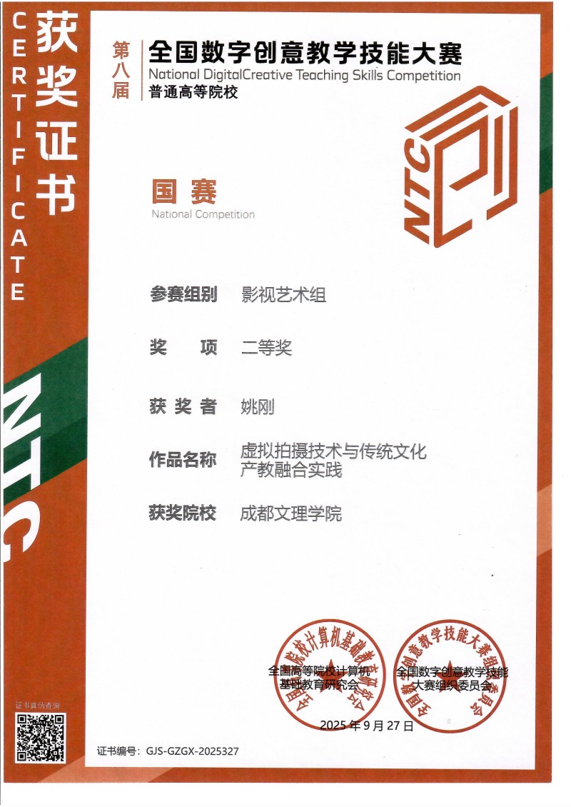 第八届“全国数字创意教学技能大赛”评选结果揭晓,艺术学院摄影系主任姚刚老师的参赛作品《虚拟拍摄技术与传统文化产教融合实践》凭借其创新性与实践价值。