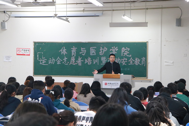 月日中午时分体育与医护学院第十七届师生运动会志愿者培训暨运动会安全教育于举行体育与医护学院党总支书记袁久斌、学生党支部书记陈姣老师、学生工作办公室全体辅导员、基础护理部专业教师王婷婷、参与此次运动会急救志愿服务队的全体同学及各班主要学生干部参加此次会议。会议开始王婷婷对应急医疗小组志愿者做业务培训。王老师向同学们讲解并展示基本的医疗救急措施针对的运动过程中有可能出现的不同运动损伤王老师从损伤辨别损