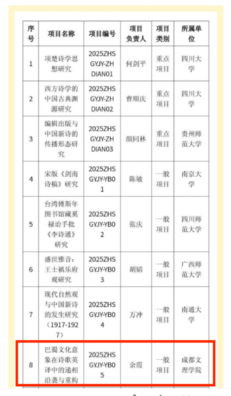 四川省重点中华文化研究院中华诗歌研究院和四川省民办教育协会发布2025年度研究课题立项公告,外国语学院余霞、王小芳、徐倩和王欢4位老师申报的课题获得立项。