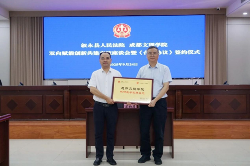 成都文理学院与叙永县人民法院举行产教融合、协同育人交流活动,叙永县人民法院党组书记、院长何锋,成都文理学院文法学院院长徐学东。
