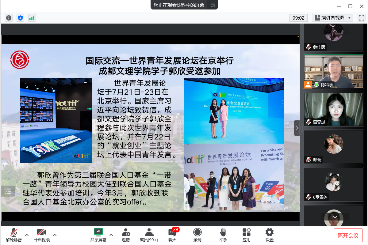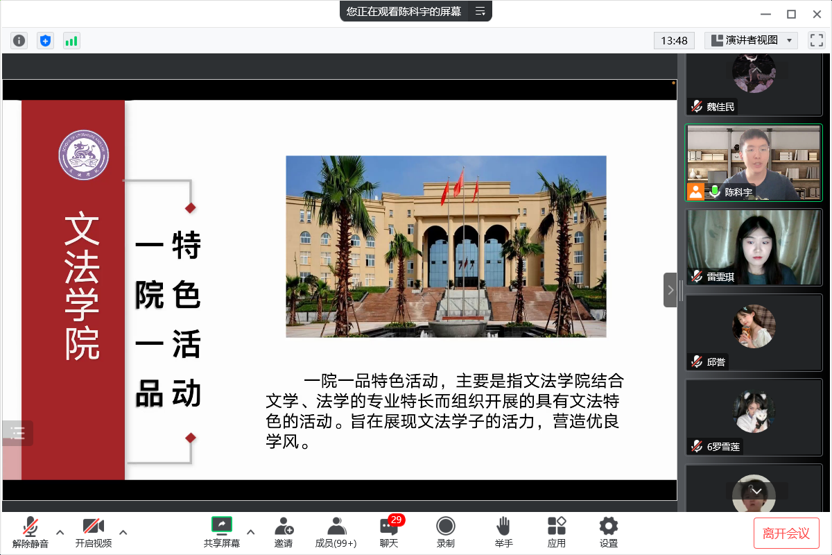 9月16日下午,为丰富学生的校园文化生活,推进校园文化建设,文法学院开展校园文化宣讲活动,分团委书记王晨静、分团委学生干部以及2022级全体新生参加,分团委学生干部担任宣讲人。由于疫情防控需要,本次活动采用线上形式开展。