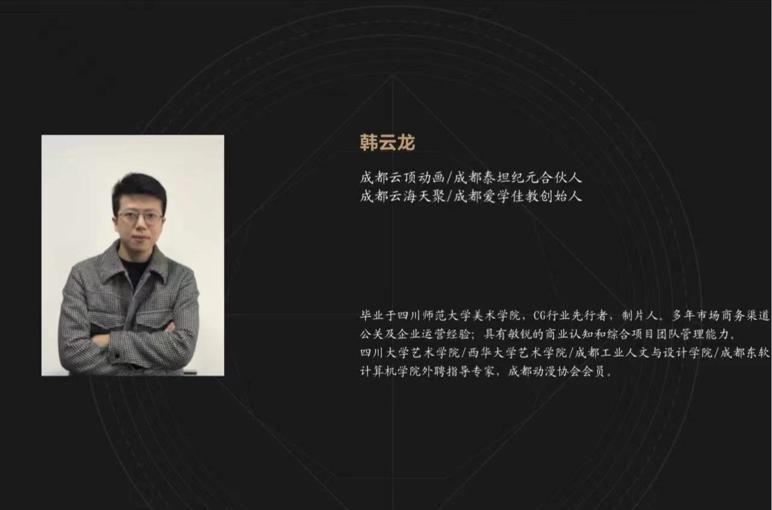 CG行业资深从业者韩云龙作为本次讲座的主讲人。韩老师作为成都云顶动画、成都泰坦纪元合伙人,同时也是成都云海天聚、成都爱学佳教的创始人、资深制片人,有着多年市场商务渠道公关及企业运营经验,并具有敏锐的商业认知和综合项目团队管理能力。