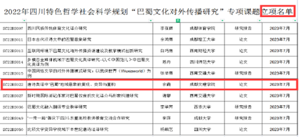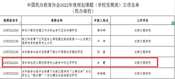 今年上半年,外国语学院余霞老师的课题“唐诗英译中“巴蜀”地域意象的复现、变异与重构”获2022年四川省社科联“巴蜀文化对外传播研究”专项规划课题立项。余霞老师的另一个课题“语料库在民办高校英语专业教学中的应用研究”也获中国民办教育协会2022年度规划课题立项。