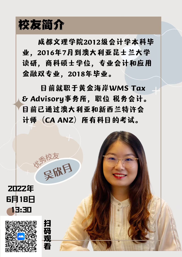 6月18日下午1时30分,会计学院开展了“跨越山海,连接梦想”校友分享交流活动,本次活动以“奋斗青春展望未来”为主题,通过线上方式举行,活动邀请到了会计学院2012级学生吴欣月、2014级学生陈奇两位优秀校友担任嘉宾,会计学院专职老师王皓冰老师担任本次活动主持人。