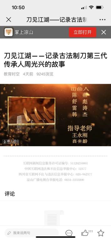 5月22日,由我校传媒与演艺学院2018级广播电视编导专业学生罗贤、张硕、隗新玲、李婷婷以及张浩然5位同学主创的纪录片作品《刀剑江湖》在凉山彝族自治州电视台新媒体平台首播,并将于6月在该台新闻频道持续播出。
