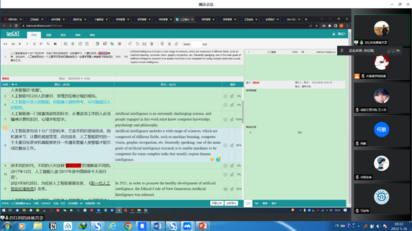 活动内容涉及语言桥LanMT翻译系统的应用分享。语言桥苏老师从六大板块对翻译系统展开介绍:能满足专业化翻译项目管理的人机共译系统;能提供“语料/术语采集、加工、检索”等功能的多语数据管理系统;能提供“仿真实训、教学、批改”等功能的智能翻译教学实训系统;能实现多语种快速翻译的语言桥自主研发的文档快译版块;以及能快捷获取双语语料的语料对齐功能。其中LanMT翻译是整个翻译系统中最重要的部分,它支持翻译引擎的私有化部暑和定制化训练。活动全程,老师们认真学习,积极探讨,对整个LanMT翻译系统有了初步的了解。