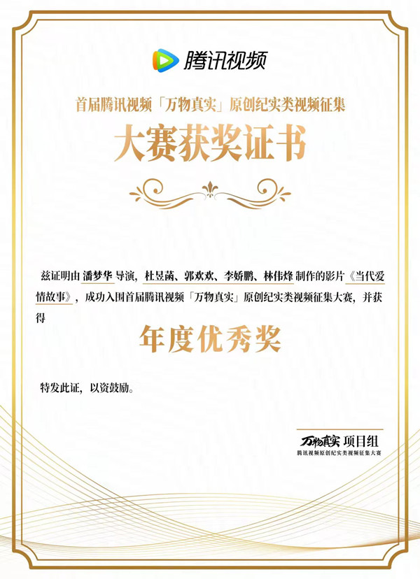 此次大赛由腾讯视频与广州大学生纪录片节联合主办,大赛以“万物真实”为主题,以开放姿态、不设限的创作征集吸引许多创作者记录世间精彩。大赛自2021年12月1日启动以来,共有超过1万名优质创作者投稿,站内总播放量超3亿。《当代爱情故事》这部作品自投稿以来在腾讯视频获得2.3万播放量,该片主要讲述一对年轻情侣双向奔赴的爱情故事,作者欲通过该片表达当代年轻人的爱情观,向观众传递积极向上、乐观无畏的生活态度。(传媒与演艺学院 供稿)