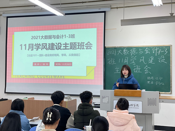 11月30日,会计学院组织2021级大数据与会计1-3班在教学楼D302开展了11月学风建设主题班会。会计学院学生二支部书记陈琴及大数据与会计专业全体同学参加,会议由班导生胥莎主持。