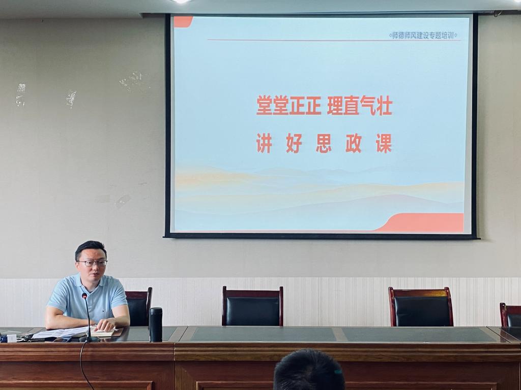 11时,第三场培训会召开,教师党支部书记,古威副教授以“堂堂正正,理直气壮,讲好思政课”为题,介绍了学校和学院“三风”建设的相关情况、结合高校教师行为规范、教师行为十项准则,从师德师风的角度对新进教职员工开展培训。