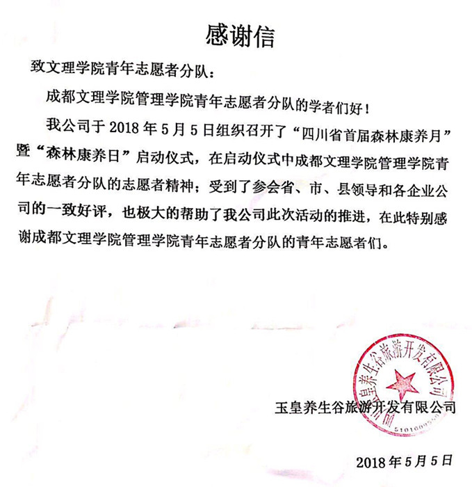 管理学院青分队六名志愿者积极到场参加,会后收到主办方的感谢信。信中提到:“在启动仪式中,成都文理学院管理学院青年志愿者分队的志愿者精神,受到了参会省、市、县领导和各企业公司的一致好评,也极大的帮助了我公司此次活动的推进,在此特别感谢成都文理学院管理学院青年志愿者分队的青年志愿者们。”