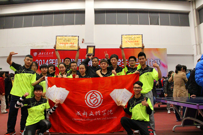 12月6日、7日,由四川省教育厅体卫艺处、成都市高校体育协会主办的2014年四川省高校第二届大学生乒乓球比赛在西南交通大学犀浦校区乒乓球馆举行。由我院学生社团 “乒临天下”国球社选拔组建的乒乓球校队共计15名队员首次参加了本次比赛,并获得团体冠军1项,非团体冠军3项,三等奖1项。
