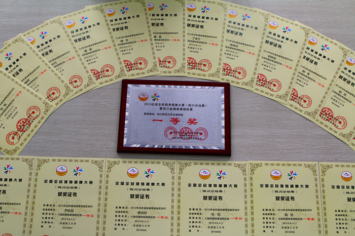 5月11日,2014全国全民健身操舞大赛四川分站赛暨四川省健美操锦标赛在成都理工大学体育馆落下帷幕,我院健美操代表队荣获普通院校组五级轻器械、普通院校组六级轻器械和体育院校组六级有氧舞蹈三个组别的一等奖,并将参加10月8日在青岛举行的全国总决赛。本届比赛吸引了78支代表队的近2000名运动员参赛。