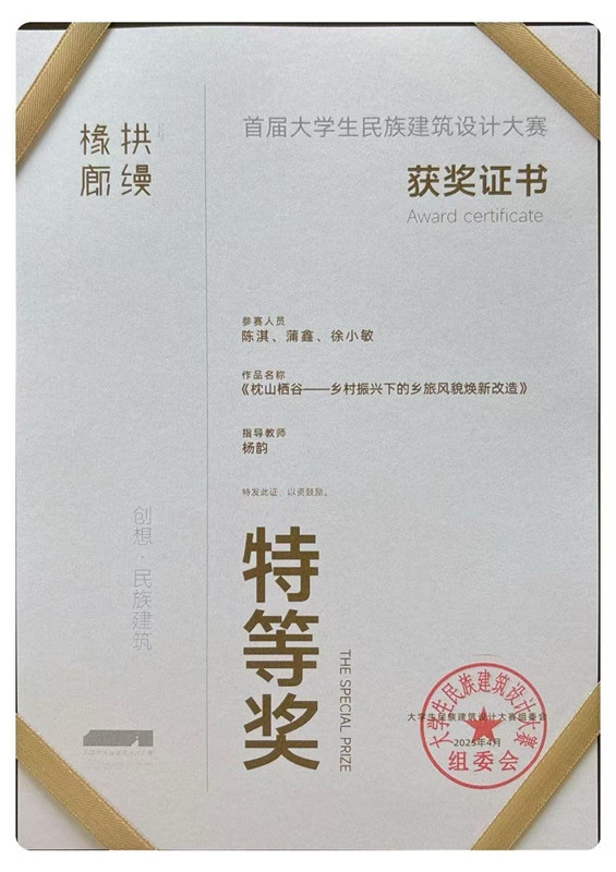 此次大赛以“椽拱·廊缦”为主题,自去年六月开赛以来,吸引了全国12个省份的近500份优秀参赛作品,展示了各高校在民族建筑设计领域的创新与实力。经过层层评选,建筑学院风景园林专业蒲鑫、陈淇、徐小敏团队的作品《枕山栖谷——乡村振兴下的乡旅风貌焕新改造》脱颖而出,荣获大赛特等奖!在风景园林专业老师的悉心指导下,团队深入挖掘民族建筑文化精髓,结合现代设计手法,打造出兼具传统韵味与当代功能的乡旅改造方案。作品以“乡村振兴”为切入点,巧妙融合地域特色与生态理念,展现了扎实的专业功底与创新思维,赢得了评委的高度认可。