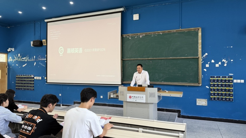 会谈结束后,蒋董事长亲自为外国语学院学生作了就业实习岗位宣讲。(外国语学院 供稿)
