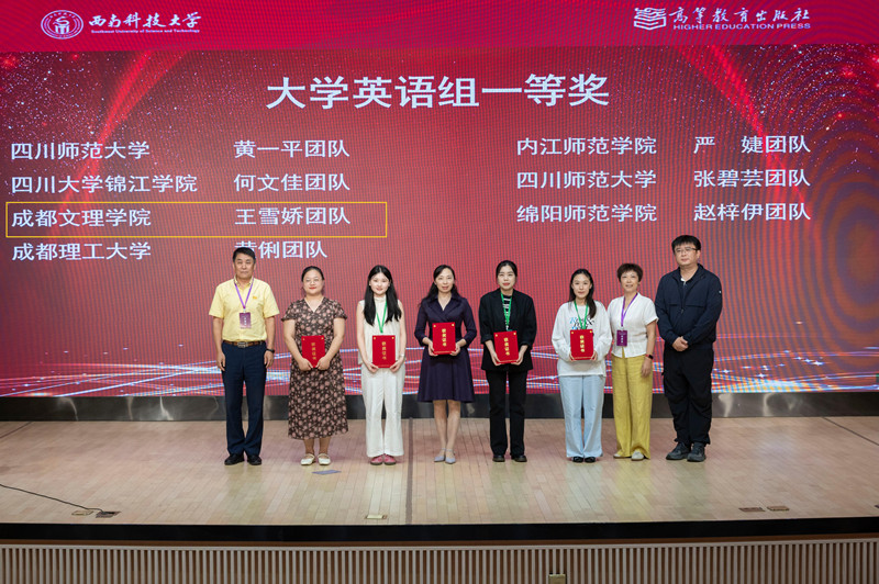 9月27日,四川省“高教社杯”普通本科高校外语课程思政教学比赛复赛在西南科技大学圆满落幕。在这场高水平赛事中,我校外国语学院大学外语教研室三支进入复赛的教师团队凭借扎实的教学功底、深刻的思政内涵与创新的教学设计经比赛分获大学英语组一、二等奖。其中王雪娇团队(成员:李洋、涂春燕、王琴、高玉蓉)获一等奖;都洁团队(成员:周靓、蒋亚玲、罗芮)和孙倩团队(成员:杨凌晨、李鑫炜、王欢)获二等奖。