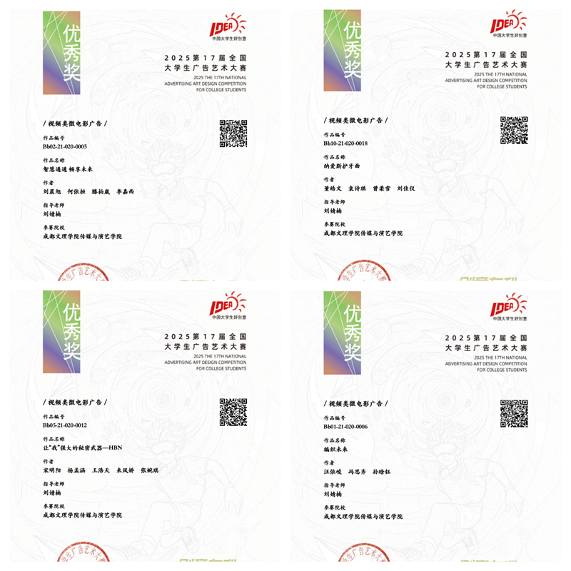 近日,第十七届全国大学生广告艺术大赛(简称“大广赛”)获奖名单正式公布,我校传媒与演艺学院师生再传捷报,共斩获国家级奖项5项、省级奖项63项,其中国家级三等奖1项,优秀奖4项,省级一等奖4项,省级二等奖9项,省级三等奖31项,优秀奖19项,奖项延续了我院在该项赛事中的稳定高水平表现,充分彰显了学院在微电影、短视频、广播与文案多元广告赛道上的跨媒体创作实力与复合型人才培养成效。