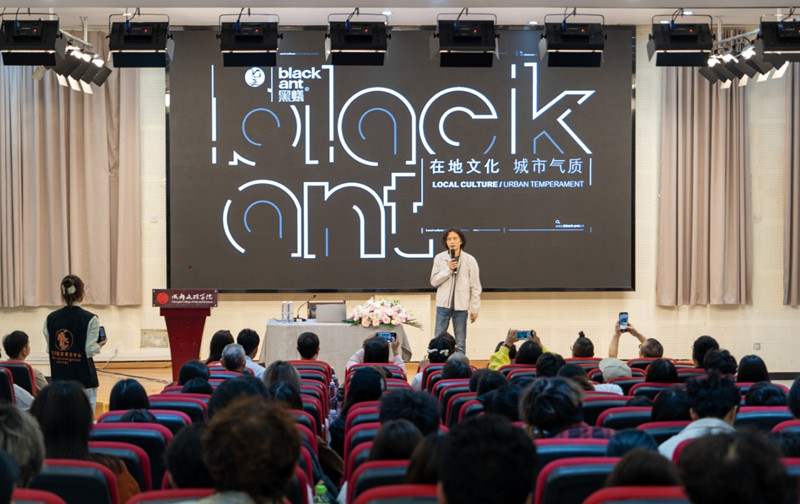 讲座开始,成都黑蚁文化创意集团股份有限公司董事长傅冰以《在地文化,城市气质》为题,解析传统符号适配当代审美、历史文脉活化城市空间的路径,并分享文创实践:团队以说唱俑笑容为核心,重构绿叶啤酒包装推出六款特色易拉罐;还打造机甲风熊猫茶罐、“有信仰的茶”系列及四川景点文创,以国潮插画包装推动传统文化创新。