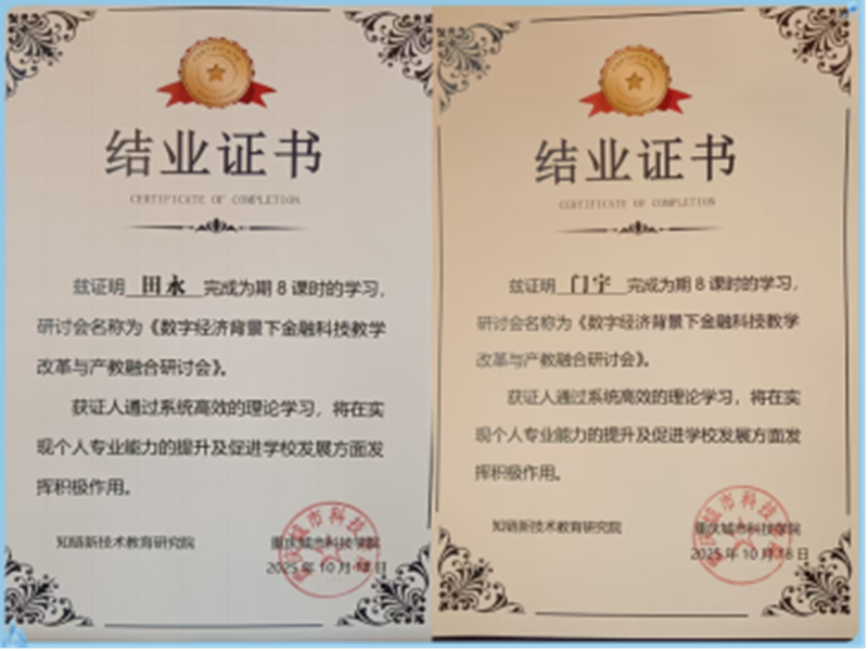 会议结束后,门宇老师和田永老师被授予“数字经济背景下金融科技教学改革与产教融合研讨会”结业证书。该证书由知链新技术教育研究院和重庆城市科技学院联合颁发,标志着两位老师在金融科技教育改革领域的专业能力得到了权威认可。