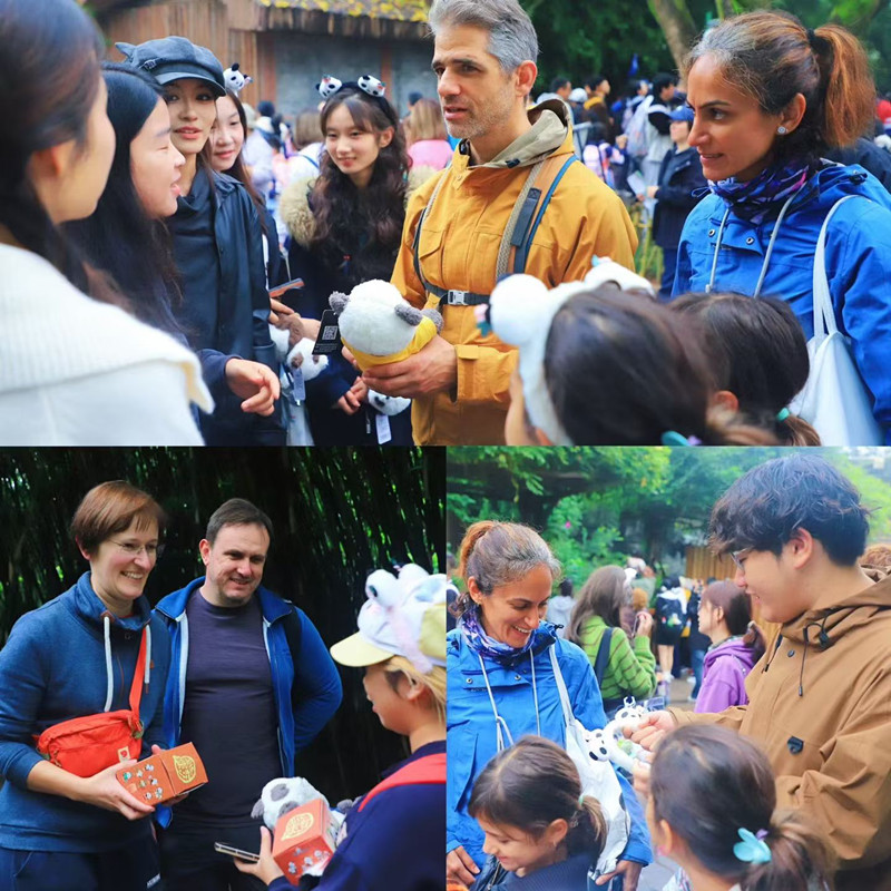 活动当天,同学们走进熊猫馆,通过沉浸式观察,细致记录大熊猫的行为姿态与互动细节,为后续创意创作积累丰富的一手素材。参观过程中,同学们积极与外国游客展开交流,围绕熊猫文化展开轻松愉快的对话。这场跨文化互动不仅丰富了创作视角,也为熊猫IP注入了更多国际化元素,使其在彰显中国文化底蕴的同时,更具全球传播潜力。