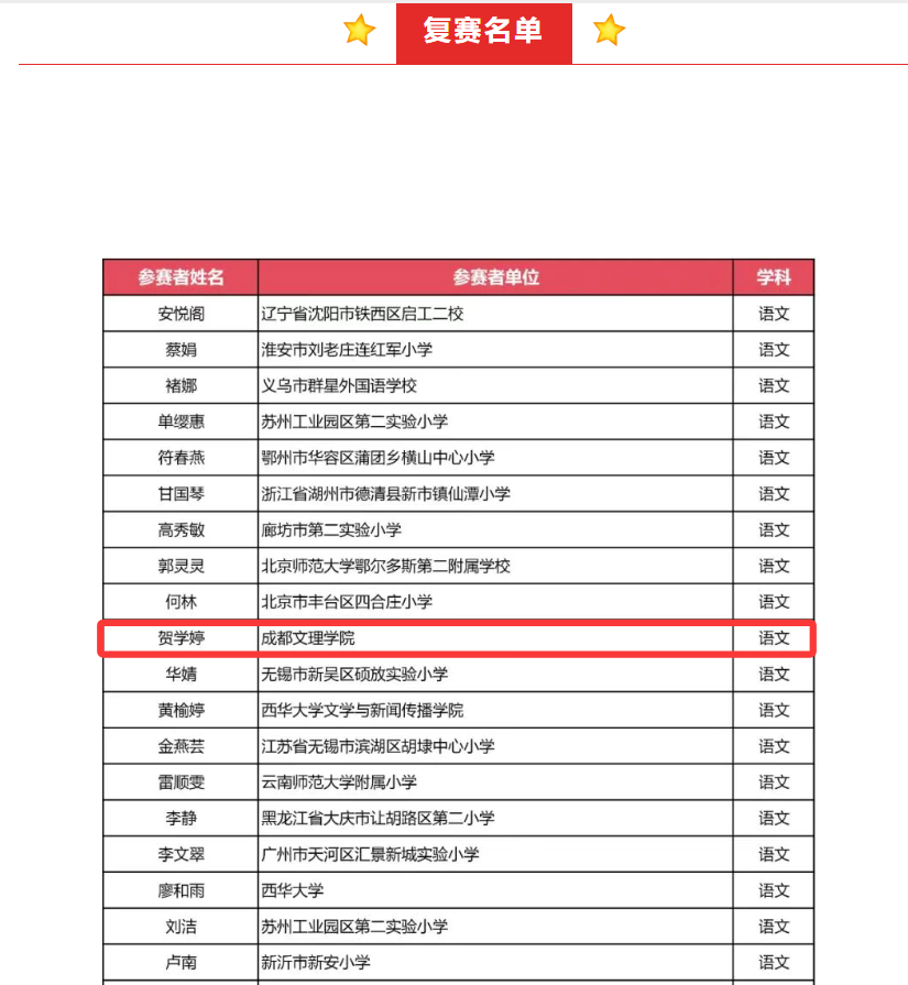 近日,第三届全国小学名师发展联盟“优课堂”全国教学技能大赛复赛入围名单正式揭晓。文法学院贺学婷同学凭借扎实的教学技能与创新设计成功晋级,成为本次大赛语文组唯一一名本科学生晋级者,其余晋级选手均为一线教师及少量研究生,充分展现了我院汉语言文学(师范)专业学子的过硬实力。