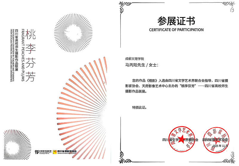 在近日开幕的2025巴蜀青年摄影季中,艺术学院摄影系学生作品成功入选多个展览单元,展现出扎实的专业功底与积极的创作活力。其中,马丙阳、张伊等16名学生的20组作品,与陈龙等4位教师的作品共同构成了“桃李芬芳”高校师生联展中的独立主题展区“变奏场”,该展区由新视界设计产业学院支持。同时,学生黄欢欢的个人作品成功入围摄影季的另一独立单元——“2025四川省新人新作展”,体现了学院人才培养的多元成果。
